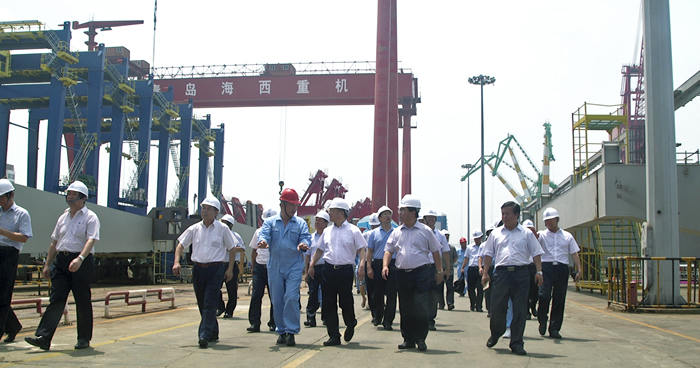 在海西重機(jī)總裝現(xiàn)場(chǎng),張德平副市長(zhǎng)實(shí)地考察了待批量發(fā)往黎巴嫩的岸橋和輪胎吊項(xiàng)目、發(fā)往馬來西亞的帶斗門機(jī)項(xiàng)目、發(fā)韓國(guó)鮮光新港的軌道吊項(xiàng)目及承制、調(diào)試的功能性海工平臺(tái)項(xiàng)目等。并聽取了海西重機(jī)董事長(zhǎng)孫國(guó)慶關(guān)于企業(yè)上半年經(jīng)濟(jì)運(yùn)行情況、轉(zhuǎn)型升級(jí)取得的成績(jī)以及在目前經(jīng)濟(jì)形勢(shì)下的合同承接情況。