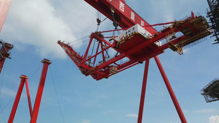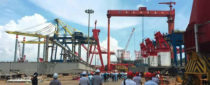 公司生產(chǎn)基地參觀同樣火爆:適逢總裝現(xiàn)場70T-60M岸邊集裝箱起重機(jī)項目整體吊裝, 1600T龍門吊平穩(wěn)吊起850噸的前后大梁、緩緩上升、精準(zhǔn)定位、穩(wěn)穩(wěn)落于該岸橋的門框上,現(xiàn)場高效的安裝工藝,給了在場的400余嘉賓巨大的視覺沖擊,掌聲、贊美聲陣陣不斷。公司整體室內(nèi)噴涂的涂裝工藝、超大型設(shè)備整機(jī)滾裝運(yùn)輸?shù)能浻布?shí)力也讓參觀嘉賓耳目一新。