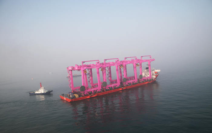 1月1日,青島海西重機為SNCT(韓國鮮光新港集裝箱碼頭有限公司)制造的8臺40噸自動化軌道吊第一批次(4臺)順利出海,成為2017年海西重機首批發(fā)運的港機設(shè)備。