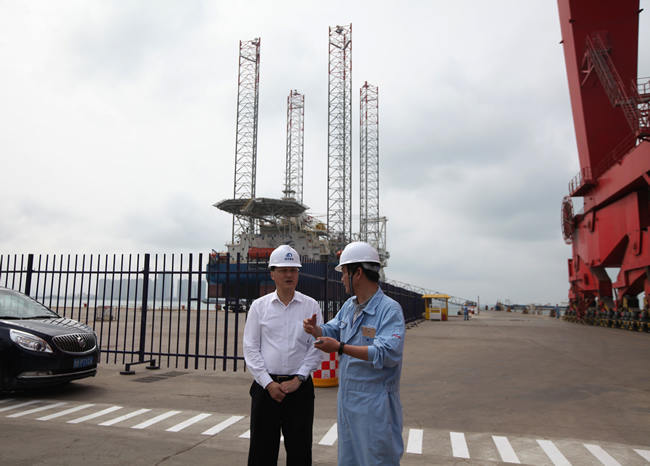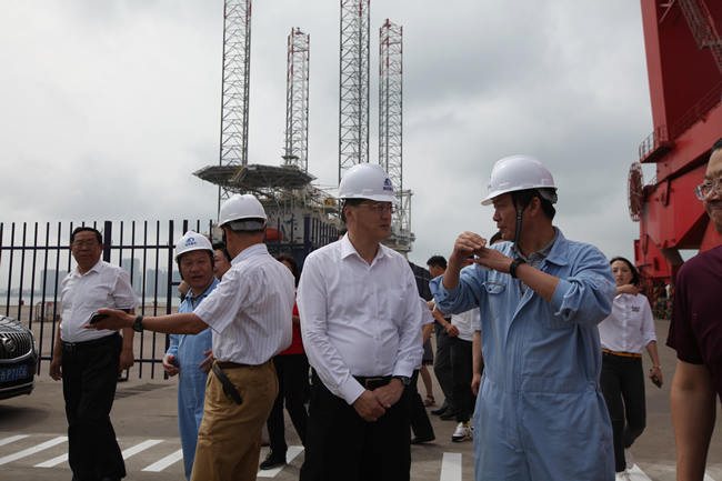 楊軍一行參觀了海西重機港口設備總裝現(xiàn)場,并重點參觀了在建的阿聯(lián)酋110米桁架自升式海工平臺,聽取了海西重機董事長鄧振山對公司目前生產經營形勢、生產負荷情況等方面的介紹,對海西重機在國際海工平臺市場上所取得的成績給予了肯定。