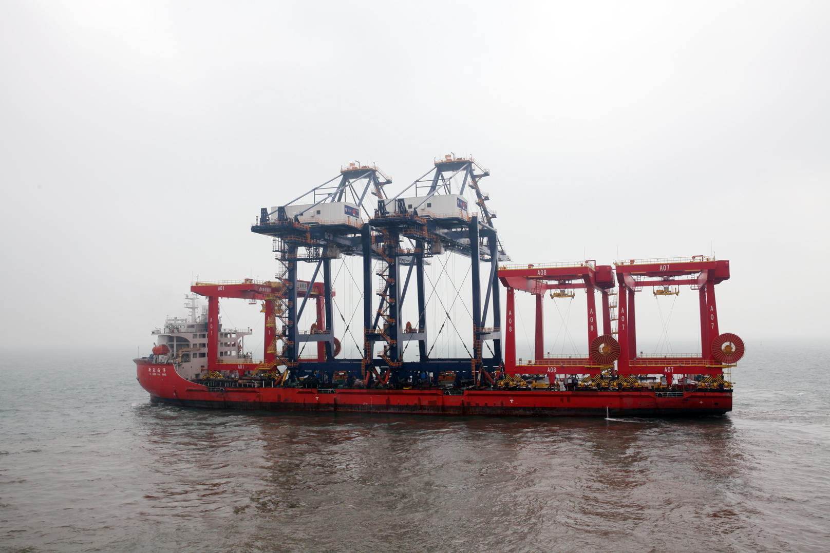 11月5日10時(shí)58分,碼頭現(xiàn)場鞭炮齊鳴,汽笛長鳴,伴隨著運(yùn)輸船主機(jī)運(yùn)轉(zhuǎn)的轟鳴聲,裝載海西重機(jī)為寧波舟山港乍浦港區(qū)承制的2臺50t-38m岸邊集裝箱起重機(jī)(簡稱G216項(xiàng)目)和為日照港集裝箱發(fā)展有限公司承制的第二批3臺自動化軌道式集裝箱龍門起重機(jī)(簡稱G219項(xiàng)目)的運(yùn)輸船緩緩駛離公司碼頭,標(biāo)志G219項(xiàng)目第二批設(shè)備和G216項(xiàng)目順利發(fā)運(yùn)。