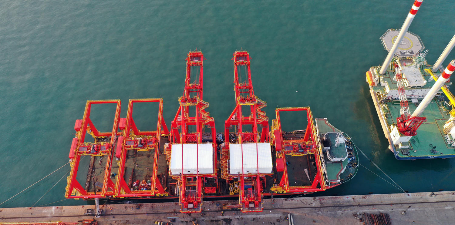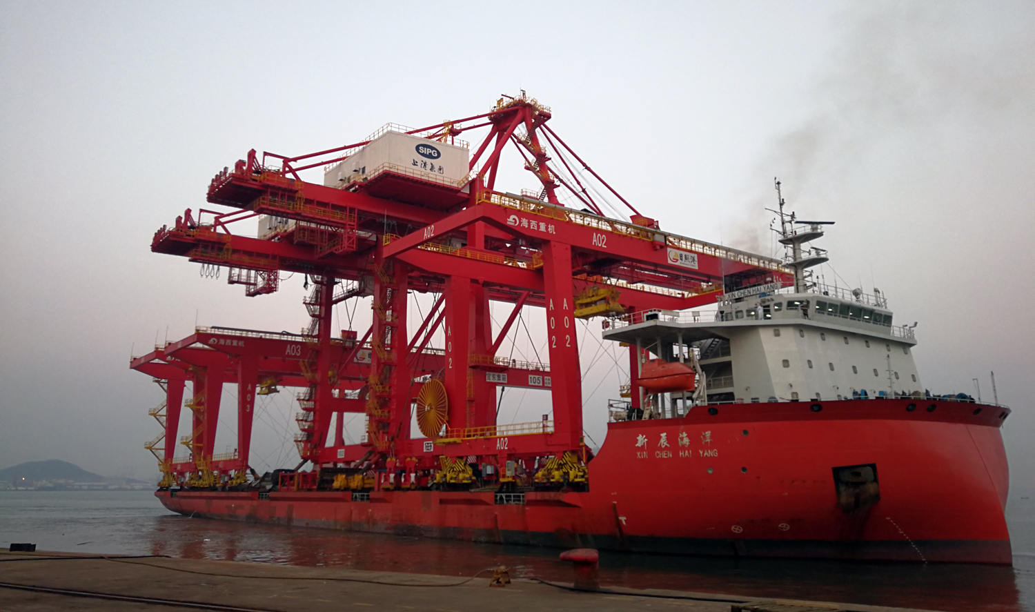 11月18日晚7時50分,G219第一臺機順利滾裝上船;19日早9時40分,G219第二臺順利滾裝上船;在兩臺機滾裝并固定完成后將船舶移位至G215項目的位置,并在當天通過晚上加班將G215第一臺岸橋的滾裝準備工作全部完成。20日早9時30分,G215第一臺機順利滾裝上船,當晚9時,第二臺岸橋安全順利滾裝上船。21日早9時,G219最后一臺機順利滾裝上船。至此,五臺機已全部完成滾裝工作。6次低平潮,5次滾裝和1次移船工作。通過合理的策劃與調度,充分利用潮水的變化,極大地縮短了裝船的時間,為后續(xù)的發(fā)運和卸船工作爭取了非常寶貴的時間!