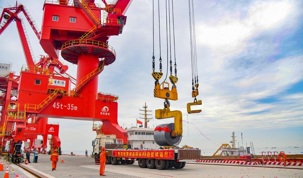 3臺(tái)門機(jī)應(yīng)用于用戶剛剛投產(chǎn)的6#泊位——日照鋼鐵精品基地配套成品碼頭工程泊位,泊位為4萬(wàn)噸級(jí)雜貨泊位,長(zhǎng)度265米,年設(shè)計(jì)通過(guò)能力120萬(wàn)噸。作為日照港山鋼碼頭有限公司成立以來(lái)建成的第一個(gè)泊位,將與山鋼集團(tuán)日照公司實(shí)現(xiàn)“前港后廠”一體化運(yùn)營(yíng),滿足成品及部分原料海路運(yùn)輸?shù)钠惹行枨螅瑸殇撹F精品基地開(kāi)辟最便捷、最經(jīng)濟(jì)的通道,推動(dòng)“鋼港”發(fā)展邁上新臺(tái)階。