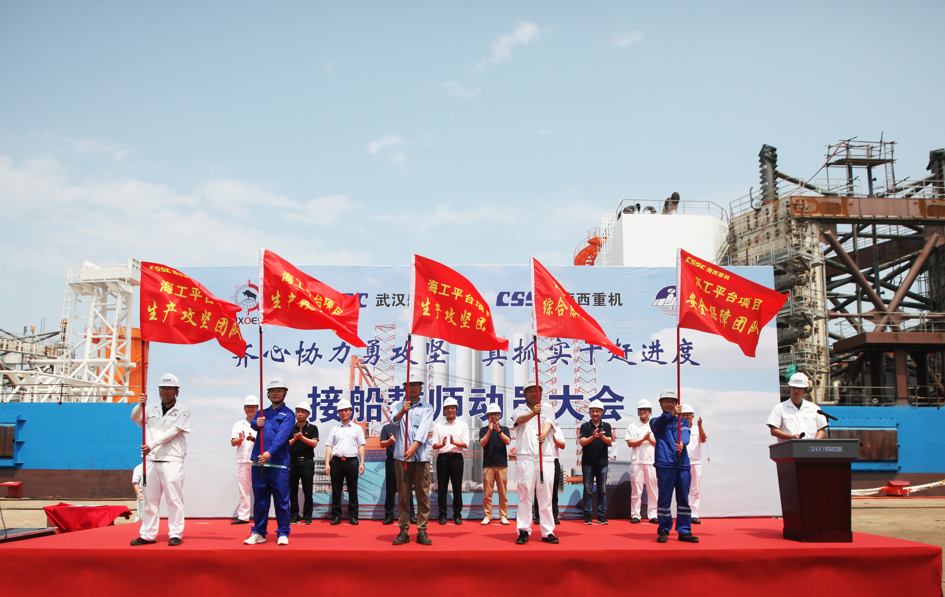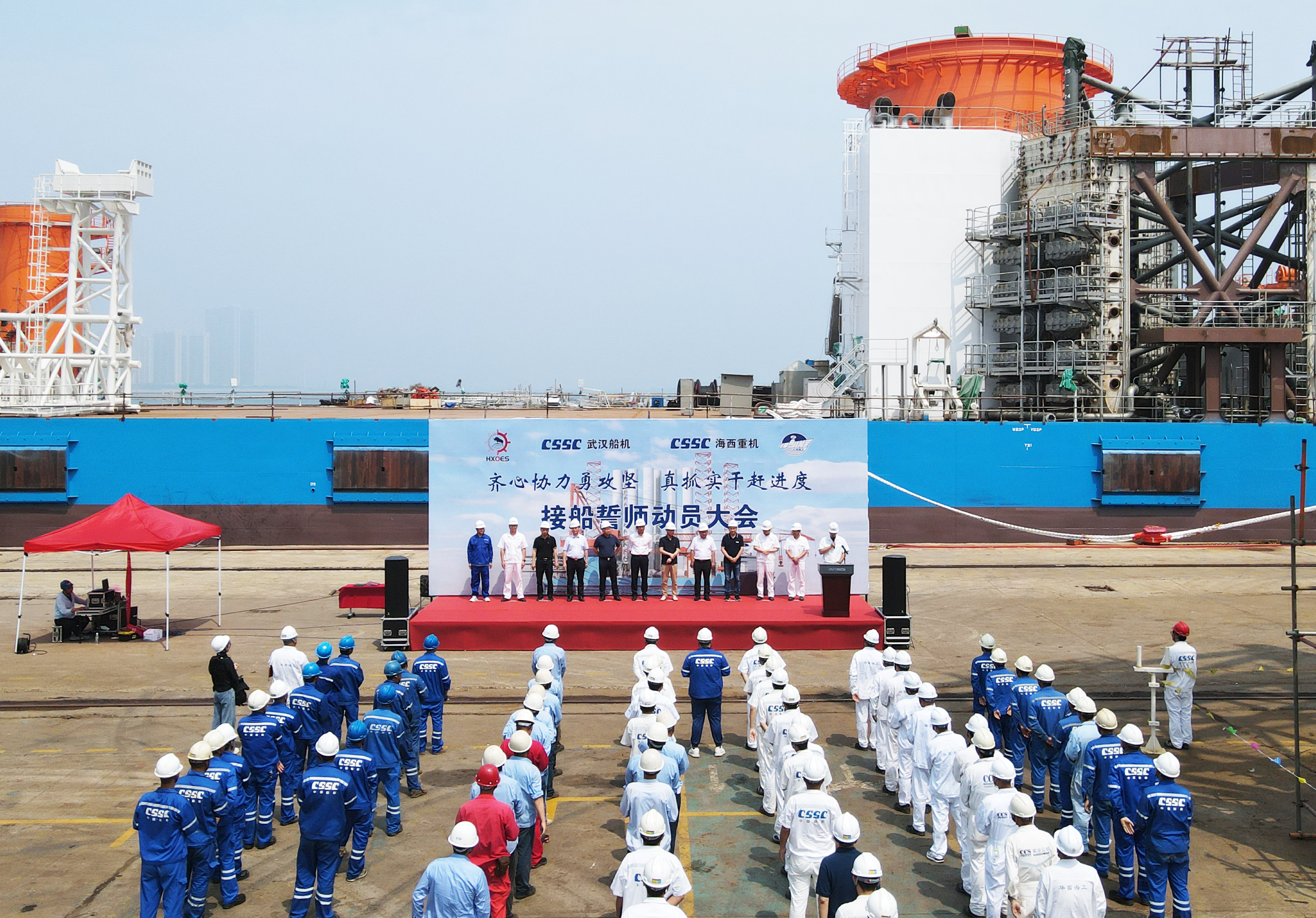 為了明確目標(biāo)、凝聚共識(shí)、齊心協(xié)力、克難攻堅(jiān),亮明迎難而上的堅(jiān)定信心和堅(jiān)強(qiáng)決心,動(dòng)員全員上下持續(xù)營(yíng)造濃厚干事氛圍,掀起“齊心協(xié)力勇攻堅(jiān),真抓實(shí)干趕進(jìn)度”的高潮,全力以赴打好海工項(xiàng)目集中攻堅(jiān)戰(zhàn),6月27日上午,武漢船機(jī)公司在海西重機(jī)碼頭生產(chǎn)現(xiàn)場(chǎng)組織開(kāi)展華西海工1600T風(fēng)電安裝平臺(tái)接船誓師動(dòng)員大會(huì)。江蘇華西村海洋工程服務(wù)有限公司董事長(zhǎng)高明、總經(jīng)理吳文勝,武漢船機(jī)黨委書(shū)記、董事長(zhǎng)馬聚勇,副總經(jīng)理孫凱,海西重機(jī)黨委書(shū)記、董事長(zhǎng)李儒新等出席動(dòng)員大會(huì)。江蘇大津重工有限公司總經(jīng)理王友軍、大連船舶重工集團(tuán)裝備制造有限公司項(xiàng)目經(jīng)理韓濤等相關(guān)領(lǐng)導(dǎo)參加了本次動(dòng)員大會(huì)。