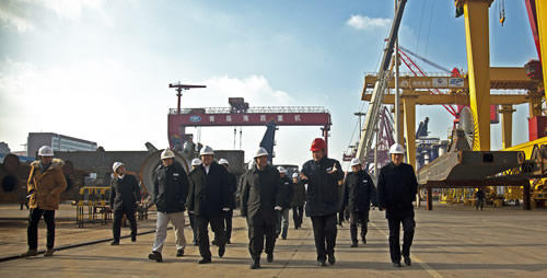 許克振一行實(shí)地考察了海西重機(jī)生產(chǎn)現(xiàn)場(chǎng)及組裝發(fā)運(yùn)現(xiàn)場(chǎng),參觀了包括韓國批量岸橋、自動(dòng)化軌道吊等在內(nèi)的港口機(jī)械設(shè)備及在制的批量自升式海工平臺(tái)項(xiàng)目,看望慰問了生產(chǎn)一線干部職工,并在隨后召開的中船重工青島海西灣基地相關(guān)企業(yè)負(fù)責(zé)人座談會(huì)上,聽取了海西重機(jī)董事長(zhǎng)孫總關(guān)于企業(yè)產(chǎn)品結(jié)構(gòu)、技術(shù)創(chuàng)新、生產(chǎn)經(jīng)營(yíng)及中長(zhǎng)期發(fā)展規(guī)劃等方面的情況匯報(bào)。