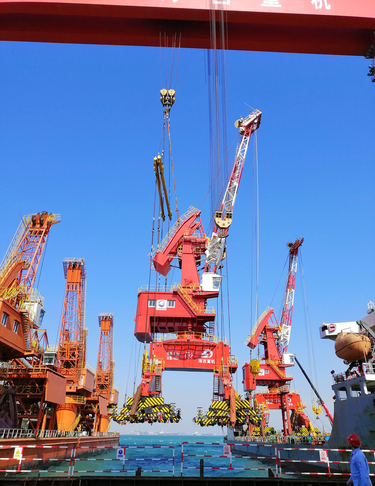 因初次起吊整機(jī)上船,船面空間緊湊,在場所有的工作人員都屏住了呼吸,時刻觀察著,現(xiàn)場除了龍門吊運(yùn)轉(zhuǎn)的轟鳴聲,就只剩下海浪拍打碼頭的聲音在耳邊回響?!耙÷湮怀晒?!”——靜靜地關(guān)注著這一過程的我們在落位成功的那一瞬間,心底無比的振奮,澎湃的心潮久久不息。自14日下午18點(diǎn)開始吊裝前詳細(xì)的聯(lián)合檢查,確認(rèn)無誤后,20點(diǎn)正式起吊,22點(diǎn)落位完成,23點(diǎn)順利摘鉤,經(jīng)過近5個小時的忙碌作戰(zhàn),整機(jī)吊裝工作一氣呵成,效率之高著實(shí)令人驚嘆。