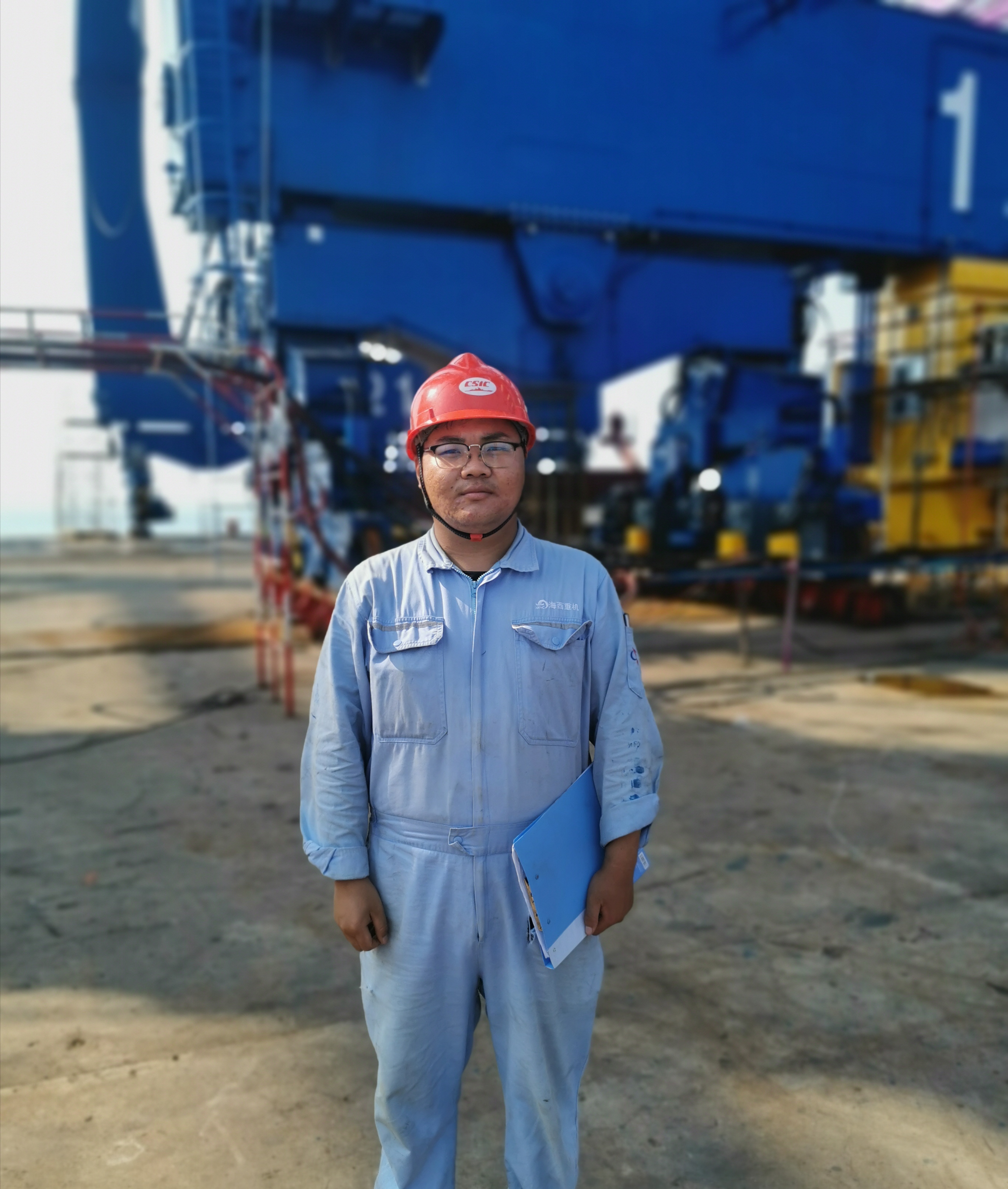 “我先后前往紅光碼頭總裝現(xiàn)場以及九橋鋼結構制作現(xiàn)場,幾乎每天都有雨,現(xiàn)場施工壓力大,經(jīng)常要冒雨趕工,在雨中工作已經(jīng)成為常態(tài),哪怕渾身濕透也要繼續(xù)。通過與施工隊溝通,在師傅牟壽堂的指導下,清點現(xiàn)場物資,不斷解決現(xiàn)場技術問題,加深了對整機結構和裝配的理解?,F(xiàn)場碼頭吊裝需要使用浮吊,浮吊方案的編制十分復雜,不僅僅要考慮吊高、幅度與載重,還要考慮水位、吊裝角度、臂架干涉等一系列的問題,為了把參數(shù)計算準確,經(jīng)常加班加點,還好努力就有收獲,現(xiàn)在對吊裝作業(yè)的理解更深了。”劉镕旗在感嘆自己的成長,感恩于他的付出,畢竟無論是小青年還是老青年,這片藍天是靠大家共同撐起的。