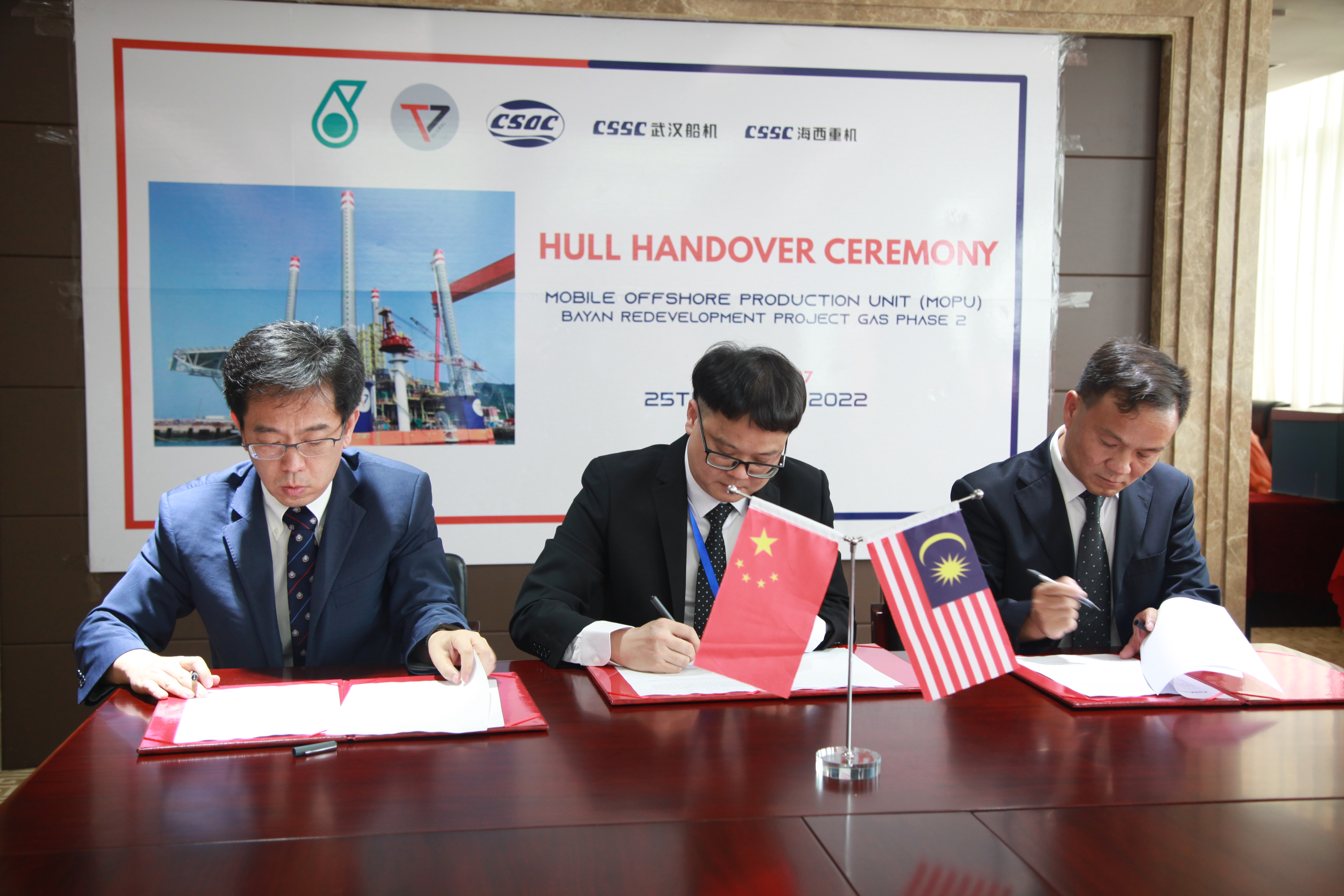 8月25日下午,由武漢船用機(jī)械有限責(zé)任公司總包,青島海西重機(jī)有限責(zé)任公司建造的馬來(lái)西亞可移動(dòng)自升式生產(chǎn)(天然氣)平臺(tái)(簡(jiǎn)稱MOPU)在中國(guó)船舶旗下武漢船機(jī)海西重機(jī)公司順利舉行交付簽約儀式,船東Tanjung Offshore、中國(guó)船貿(mào)和ABS船級(jí)社共同出席。