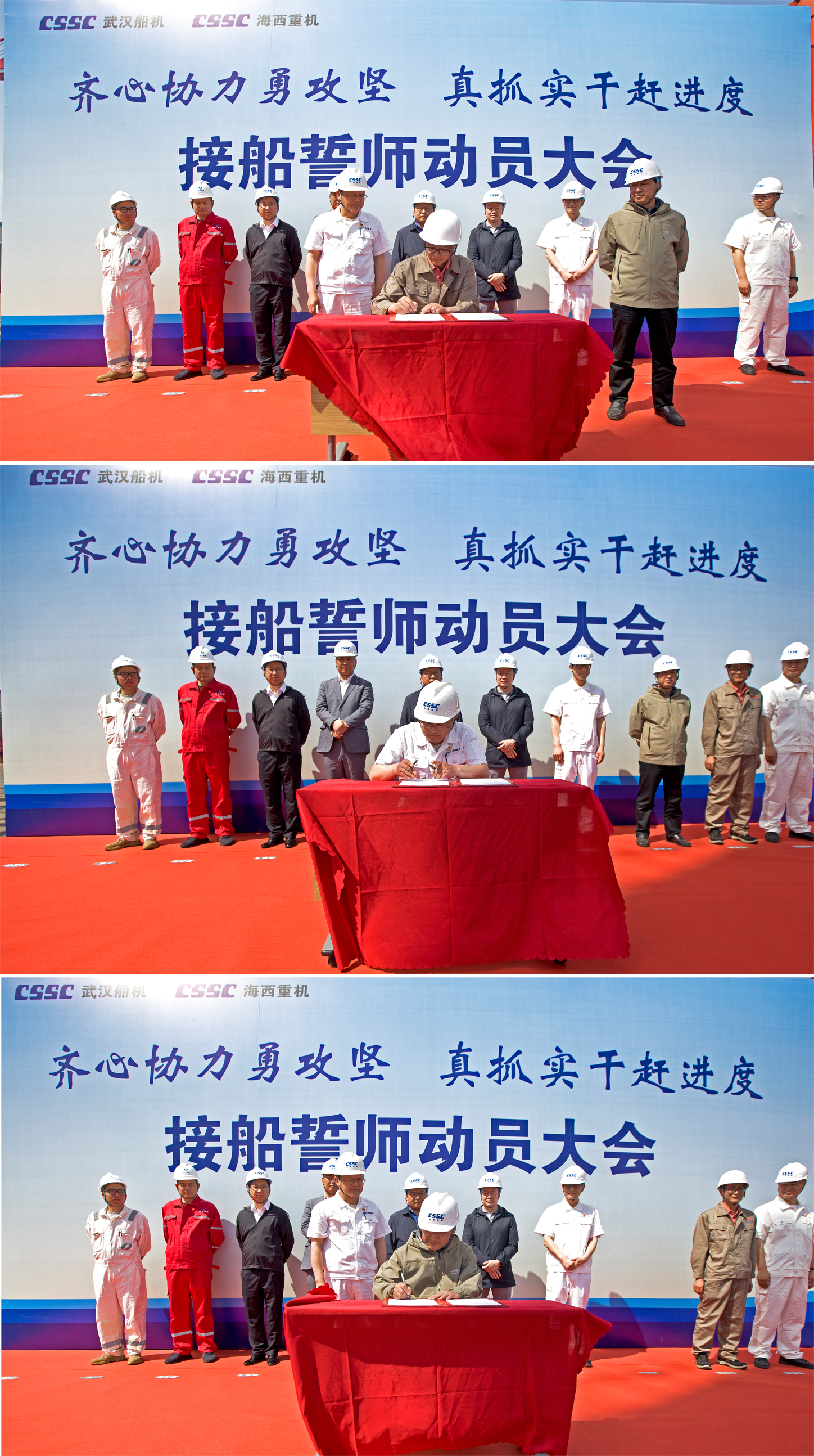 為了明確目標(biāo)、凝聚共識、齊心協(xié)力、克難攻堅,亮明迎難而上的堅定信心和堅強(qiáng)決心,動員全員上下持續(xù)營造濃厚干事氛圍,掀起“齊心協(xié)力勇攻堅,真抓實(shí)干趕進(jìn)度”的高潮,全力以赴打好海工項目集中攻堅戰(zhàn),5月25日上午,中國船舶集團(tuán)旗下武漢船機(jī)海西重機(jī)公司在生產(chǎn)現(xiàn)場組織開展接船誓師動員大會。華夏金融租賃有限公司、北京神大集團(tuán)有限公司、飛勵特船舶管理有限公司、大津重工泰州分公司、江陰雙馬重工裝備有限公司、武漢船機(jī)海西重機(jī)等相關(guān)方參加本次動員大會。