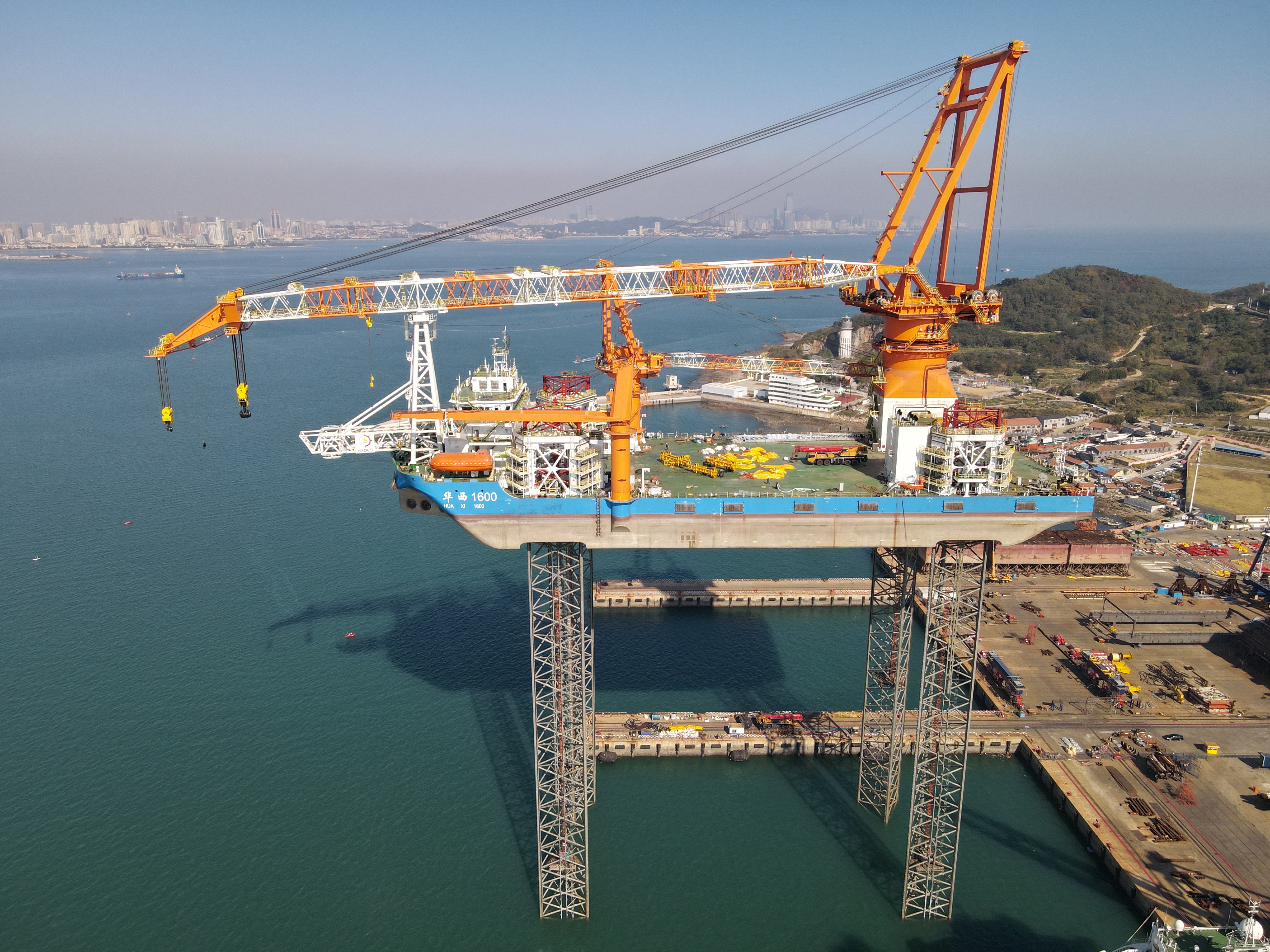 華西海工1600T風(fēng)電安裝平臺(tái)項(xiàng)目是武漢船機(jī)建造的最新一代風(fēng)電安裝平臺(tái),最大作業(yè)水深70米,主吊機(jī)起重能力1600噸,甲板作業(yè)面積相當(dāng)于11個(gè)籃球場(chǎng),是目前國(guó)內(nèi)作業(yè)水深最大、海上施工能力最強(qiáng)、功能最全、效率最高的桁架式樁腿風(fēng)電安裝平臺(tái)。