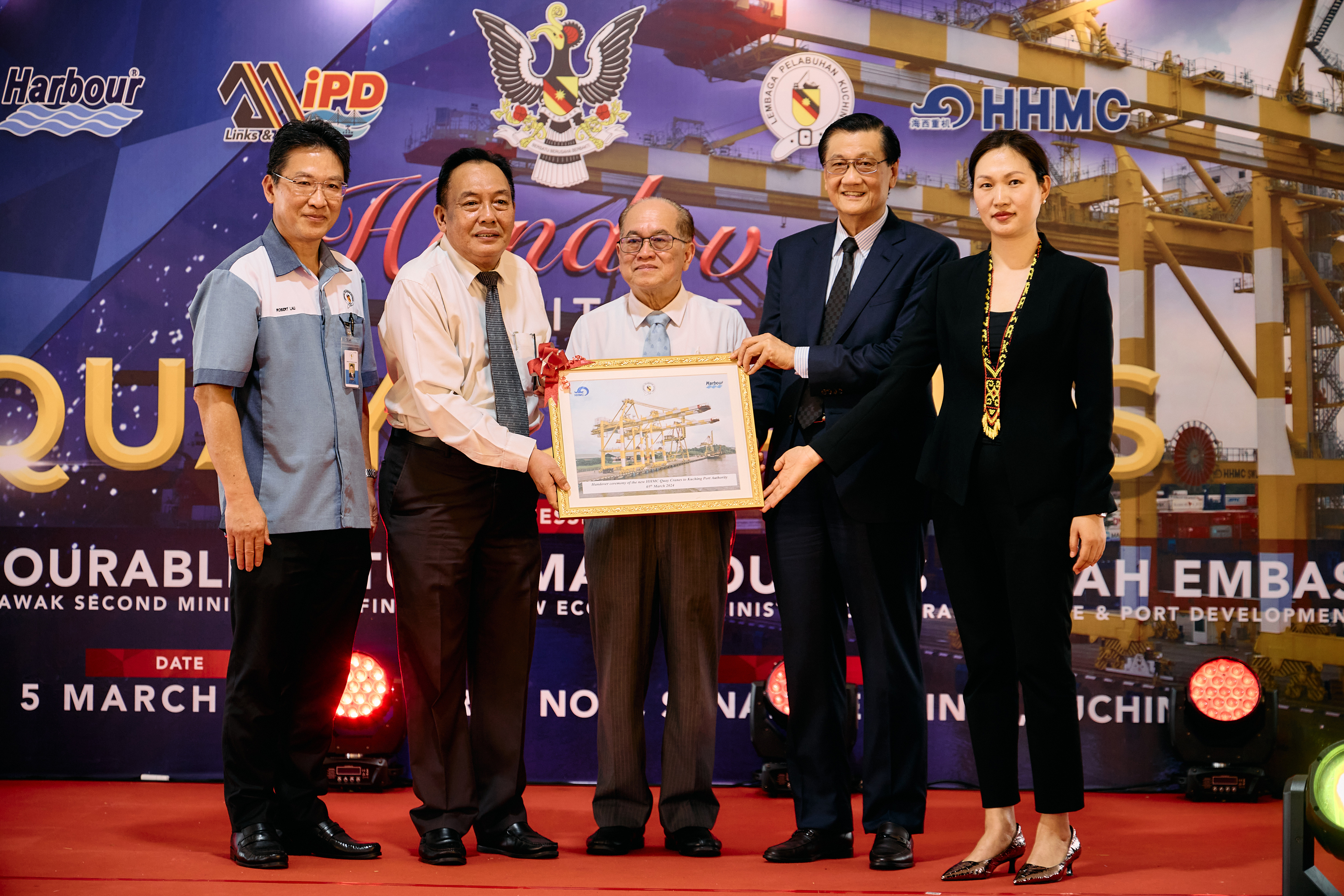 交機(jī)儀式上,馬來西亞砂拉越州副總理兼基礎(chǔ)建設(shè)與港口發(fā)展部部長Amar Douglas Uggah Embas、古晉港港務(wù)局主席Awang Bemee Bin Hj.Pengiran Ali Basah、Harbor Link集團(tuán)董事長Francis Yong Piaw Soon蒞臨現(xiàn)場并分別致辭,各方強(qiáng)調(diào)了該項(xiàng)目對當(dāng)?shù)馗劭诎l(fā)展的重要經(jīng)濟(jì)意義與社會意義,同時對海西重機(jī)產(chǎn)品以及項(xiàng)目團(tuán)隊(duì)給予了充分肯定。隨后,各方在岸橋前進(jìn)行剪彩并合影留念。