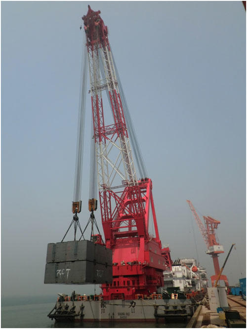 700T浮吊是我司為上海打撈局制作的全回轉(zhuǎn)浮式起重機(jī)。該機(jī)總重約2600噸,由轉(zhuǎn)盤總成、機(jī)房總成、回轉(zhuǎn)支撐及圓筒總成、人字架總成、臂架總成等結(jié)構(gòu)構(gòu)成。其額定起吊重量為700T,最大變幅幅度為68M,主要用于超重大件的吊裝作業(yè),設(shè)備安裝作業(yè)及水上施工、打撈和救援作業(yè)。