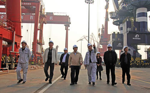 董樹(shù)奎一行實(shí)地考察了公司生產(chǎn)、組裝及發(fā)運(yùn)現(xiàn)場(chǎng),對(duì)公司在制的各類(lèi)大型港口起重設(shè)備、海工平臺(tái)等進(jìn)行了詳細(xì)考察。聽(tīng)取了海西重機(jī)總經(jīng)理孫國(guó)慶關(guān)于公司概況、生產(chǎn)經(jīng)營(yíng)、技術(shù)創(chuàng)新、企業(yè)管理及戰(zhàn)略規(guī)劃等情況的詳細(xì)匯報(bào)。